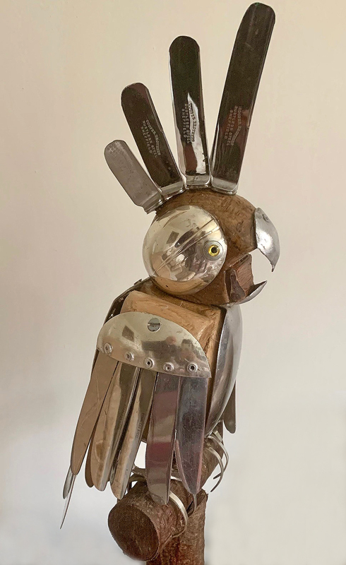 A unique collection of fauna exhibits constructed from found metal objects and wood.